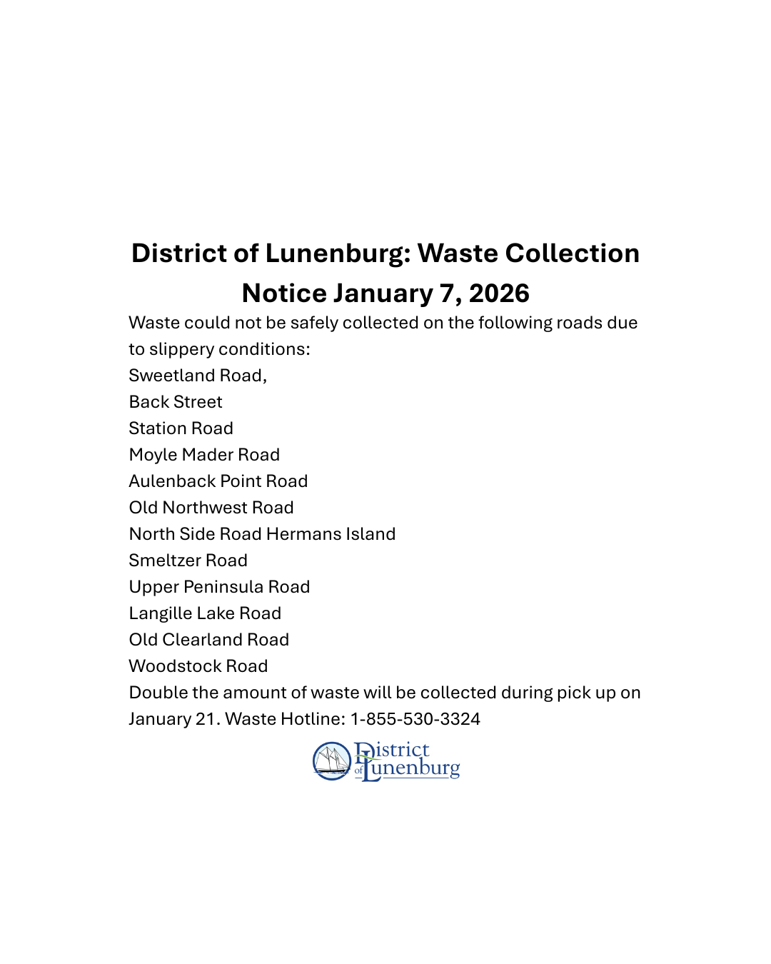 District of Lunenburg: Waste Collection Notice January 7, 2026