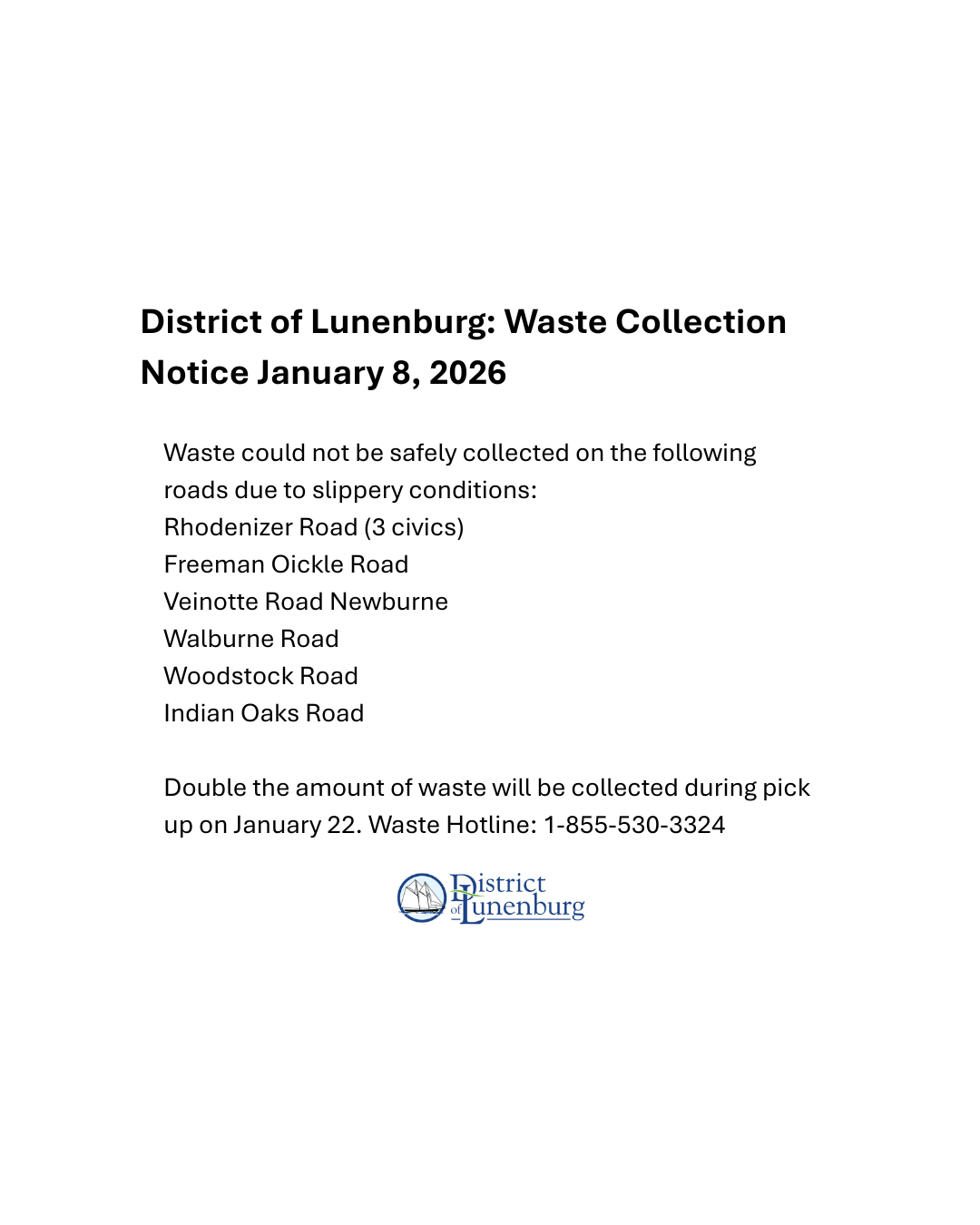 District of Lunenburg: Waste Collection Notice January 8, 2026